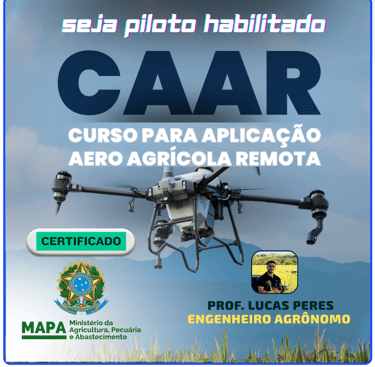 O Arsenal Completo do Piloto A+ CAAR, contendo 28 h Aulas Com Certificado Reconecido pelo Ministério de Abastecimento, Pecuária e Agricultura - MAPA O curso foi pensado em encurtar a distência entre o manual do drone e a realidade do campo